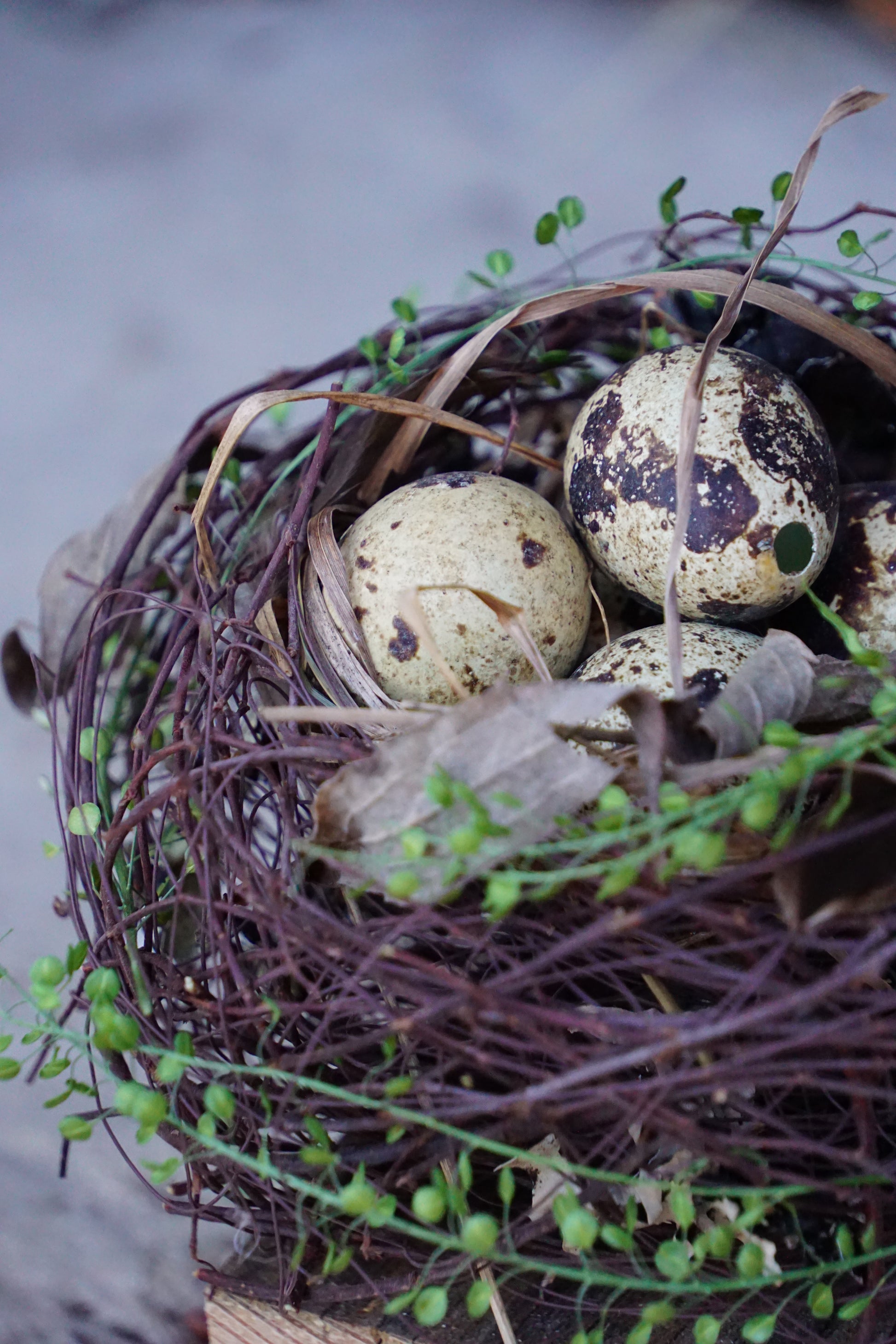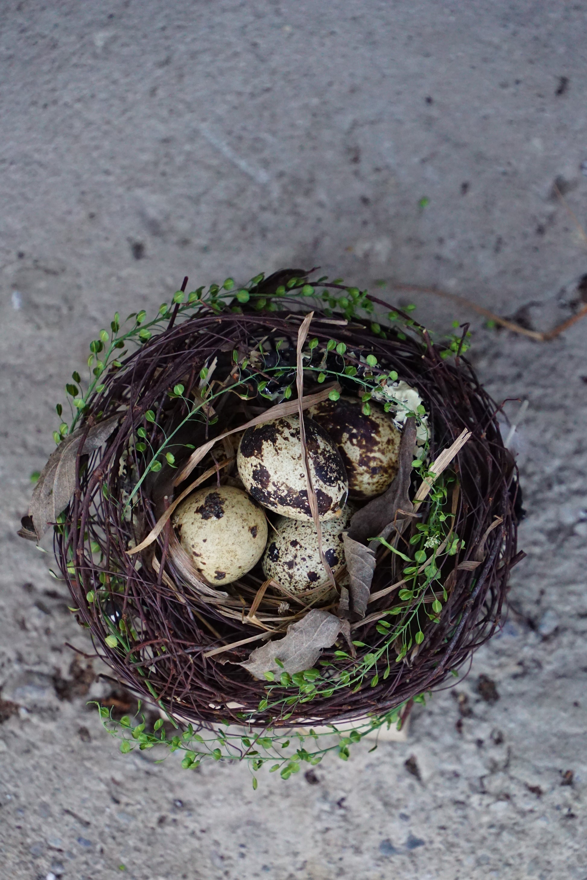 Handgefertigtes Osternest aus natürlichem Reisig und zarten Grünakzenten, arrangiert auf einem massiven Holzsockel. Mit dekorativen Wachteleiern verziert, bringt es eine natürliche, ruhige Osterstimmung in Haus, Eingangsbereich oder auf den Ostertisch. Jedes Stück ist ein Unikat.